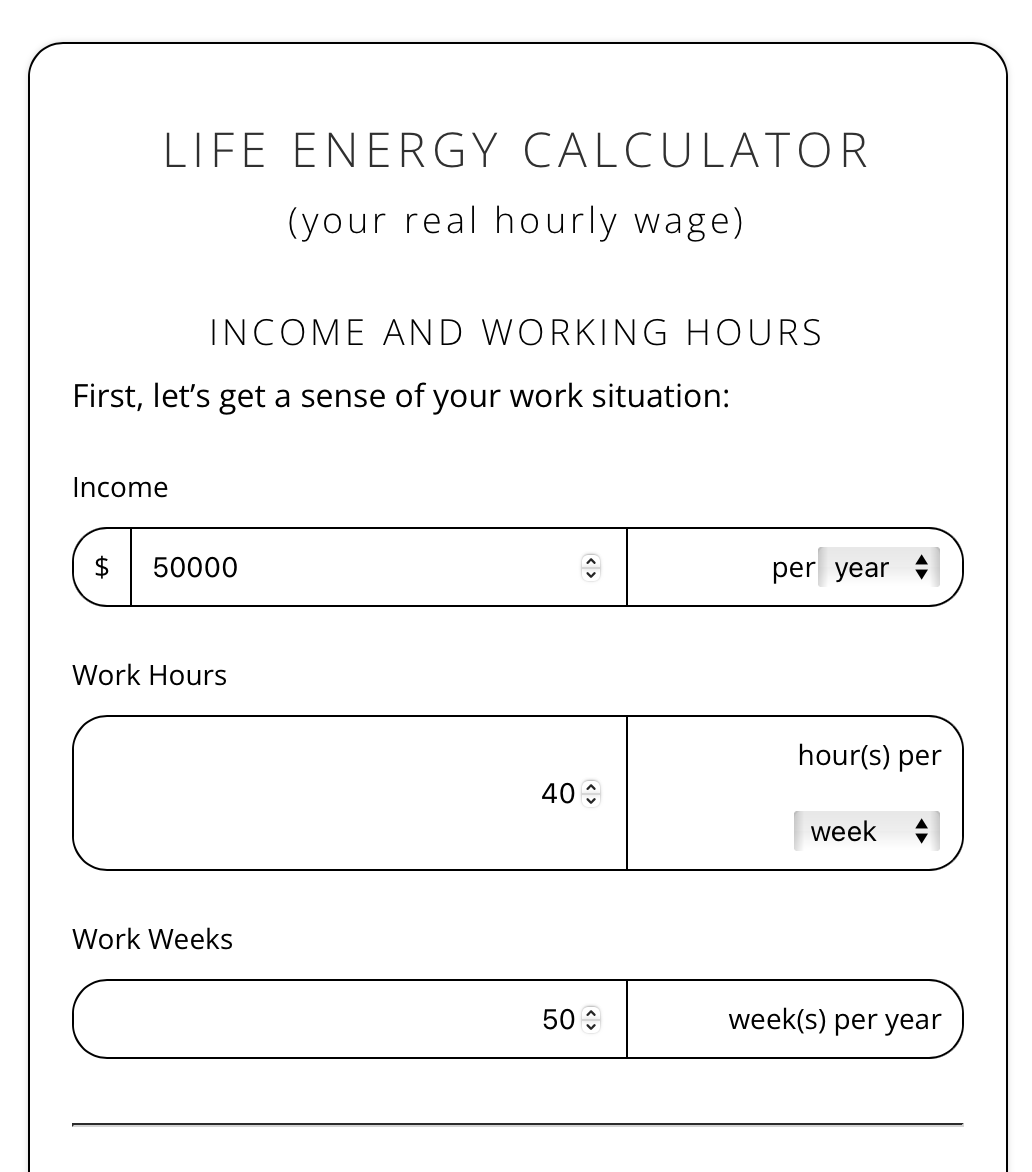 Why It’s Impactful: This concept can transform how you manage and perceive money. By tracking every dollar, you gain insight into your financial habits, allowing you to spot and eliminate unnecessary expenses. The Life Energy Calculator or (Real Hourly Wage Calculator) shows you how much you actually earn, making you aware of the real cost of small purchases. Conscious consumption ensures your spending aligns with your true needs and values.
