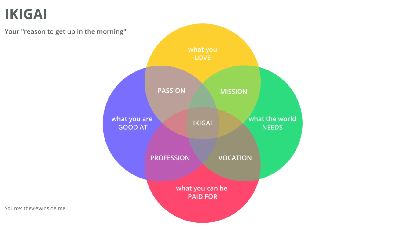 Combine what you love, what you’re good at, what the world needs, and what you can be paid for. That’s your Ikigai - the sweet spot that makes work and life feel worthwhile. Example: You love teaching people about money, you’re good at explaining complex concepts simply, the world needs accessible financial education, and you can get paid by running an online course or newsletter. Boom — that’s your Ikigai in action.