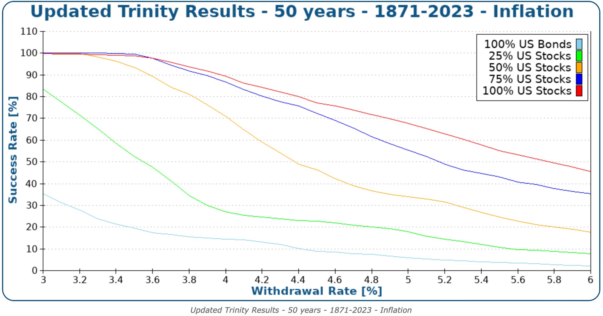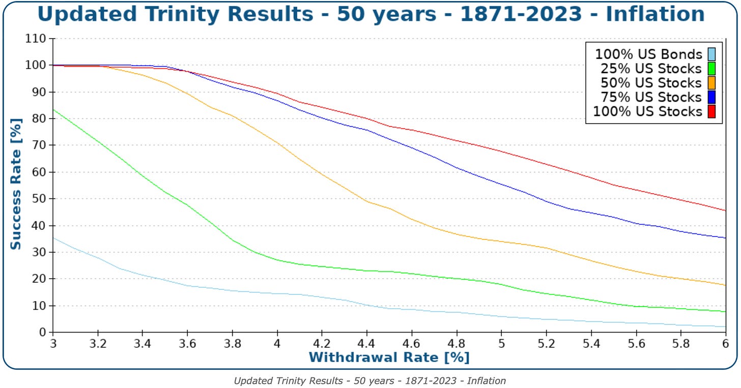 The Trinity Study, conducted by professors at Trinity University in 1998, is the foundation of the well-known 4% rule for retirement withdrawals. This rule suggests that retirees can withdraw 4% of their initial retirement portfolio annually, adjusted for inflation, and have a high probability that their savings will last for at least 30 years. Yes, yes, I can already hear you saying. “But Andy, I went hard and invested my brains out and retired at 40..so I have more like 40 or 50 years of retirement, do these numbers still stack up for me?” Relax faithful reader, I got you covered. Read on.