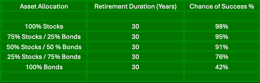 So with all of this being said, the research team put together some models for how well an investor would fare using the 4% SWR throughout the 70 years of data they studied. They used different asset allocations to see what the percentage chance of success was for each asset allocation type. Now to clarify;
