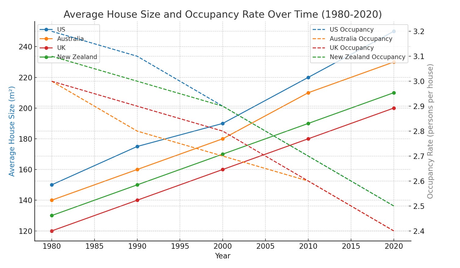 Data shows that a significant portion of larger homes goes unused. In the US, around 35% of the average home is underutilised, while in Australia, it’s 33%. In the UK and New Zealand, it’s 30% and 31%, respectively. Yet, people continue to pay for these unused spaces through higher mortgages, maintenance, and hefty utility bills. That means we're essentially paying about a third of our mortgage for a house we aren’t even using—or are barely using. So why are we doing this?